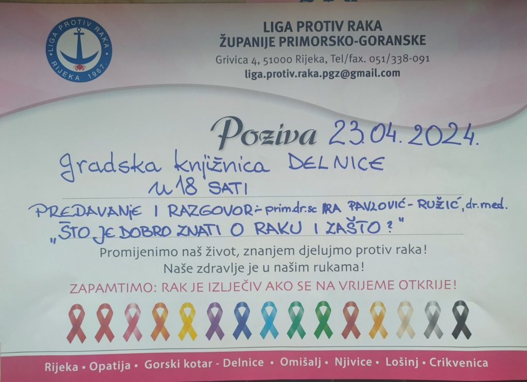Obavijest građanstvu o održavanju predavanja dr.Pavlović – Ružić na temu “Što je dobro znati o raku i zašto!” koje će se održati 23.04.2024. godine s početkom u 18:00 sati u prostoru Gradske knjižnice Janet Majnarich Delnice u organizaciji Lige protiv raka Primorsko – goranske županije.